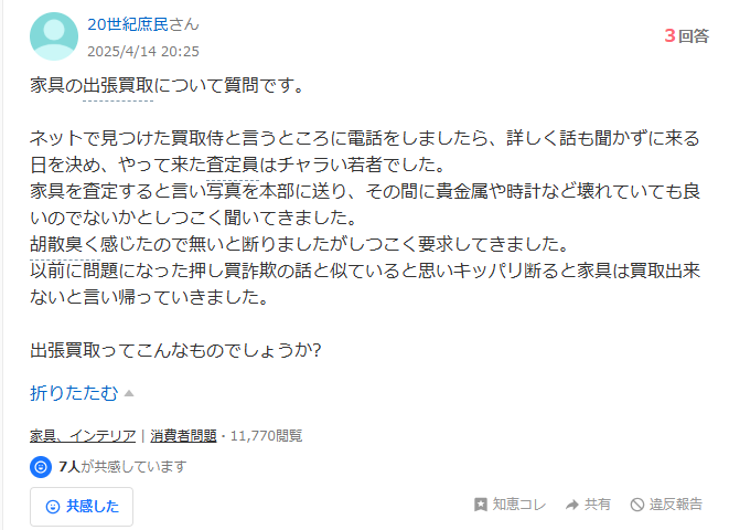 家具の出張買取について質問です。ネットで見つけた買取侍と言うところに電話をしましたら、詳しく話も聞かずに来る日を決め、やって来た査定員はチャラい若者でした。家具を査定すると言い写真を本部に送り、その間に貴金属や時計など壊れていても良いのでないかとしつこく聞いてきました。胡散臭く感じたので無いと断りましたがしつこく要求してきました。以前に問題になった押し買詐欺の話と似ていると思いキッパリ断ると家具は買取出来ないと言い帰っていきました。出張買取ってこんなものでしょうか?