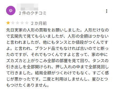 先日実家の人形の買取をお願いしました。人形だけなので玄関先で見てもらいましたが、人形の金額はつかないと言われましたが、他にもタンスとか値段がつくんですよ。と言われ、ブランド品でもなければ古いのでと断ったのですが、それでもつくんですよと言って、家の中にズカズカと上がりこみ全部の部屋を見て回り、タンスの引き出しを全部開けられ、押し入れの中まで全部見回して行きました。結局金額がつくわけでもなく、すごく感じが悪かったです。二度と利用はしませんし、星ひとつもつけたくありません。